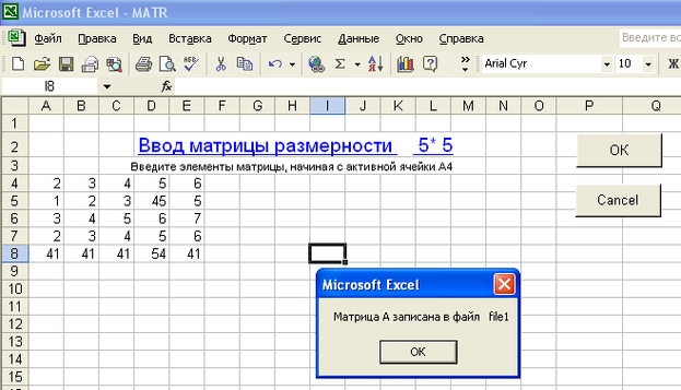 Создание кнопок ОК, ОТМЕНА, заполнение матрицы в файл, а также вывод результатов на экран.