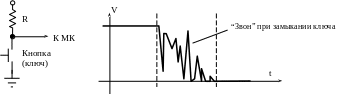 При замыкании и размыкании переключателей в цепи возникают импульсные помехи, вызванные дребезгом контактов. Эти помехи обычно называют «шумом» или «звоном». Такое явление часто возникает в системах на базах МК, где для ввода данных используется клавиатура, и «звон» может восприниматься как многократное нажатие клавиши (см. рис. 1.7). «Звон» возникает при установке и разрыве контакта путем нажатия на клавишу.