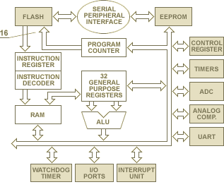 Архитектура AVR была оптимизирована так, чтобы соединить достоинства Гарвардской и Принстонской (Фон Неймана) архитектуры для достижения очень быстрого и эффективного выполнения программ. Такая организация обеспечивает высокую эффективность процессора при обработке данных.