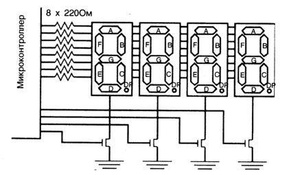 Подключение индикатора к МК осуществляется весьма просто: обычно индикатор подключают как семь или восемь (если используется десятичная точка) независимых светодиодов. Наиболее важной частью работы при подключении к МК нескольких ССИ является назначения линий вводе вывода для каждого светодиода. Решение этой задачи в начале выполнения проекта упростит вам монтаж разводки и отладку устройств в дальнейшем. Типичный способ подключения нескольких индикаторов состоит в том, чтобы включить их параллельно и затем управлять протеканием тока через общие выводы отдельных индикаторов. Так как величина этого тока обычно превышает допустимое значение выходного тока МК, то для управления оком включается дополнительные транзисторы, которые выбирают, какой из индикаторов будет находиться в активном состоянии.