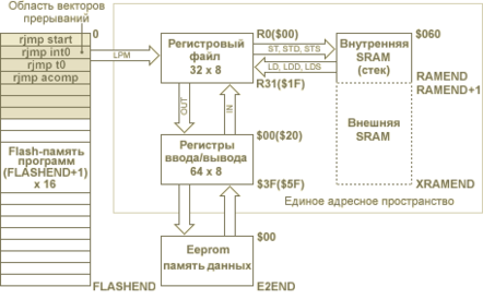 Регистровый файл, блок регистров ввода/вывода и оперативная память, как показано на рис. 2.3, образуют единое адресное пространство, что дает возможность при программировании обращаться к 32 оперативным регистрам и к регистрам ввода/вывода как к ячейкам памяти, используя команды доступа к SRAM (в том числе и с косвенной адресацией) [8].