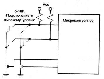Для чтения состояния определенного ключа на столбец подается сигнал, а затем считывается состояние рядов. Обычно ряды подключаются к высокому потенциалу, а опрашиваемый столбец соединяется с землей. Если при сканировании считывается низкий уровень сигнала, то это означает, что ключ в данной позиции ряд-столбец замкнут. На рис. 1.11 показаны два МОП-транзистора, которые используются для подключения столбцов к земле. Но в некоторых МК выводы могут работать в режиме с открытым коллектором, и следовательно имитировать работу этих транзисторов, делая их включение ненужным.