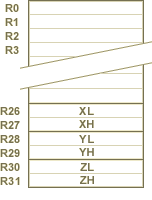 На рис. 2.3 показано распределение адресов в едином адресном пространстве. Младшие 32 адреса ($0 - $1F) соответствуют оперативным регистрам т.е. РОН. Следующие 64 адреса ($20 - $5F) зарезервированы для регистров ввода/вывода. Внутренняя SRAM у всех AVR начинается с адреса $60.