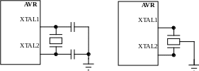 Кварцевый или керамический резонатор может быть подключен к AVR (см. рис. 2.6). Если используется одна из этих схем, то не следует подключать какие-либо другие устройства ни к одному из выводов XTAL.