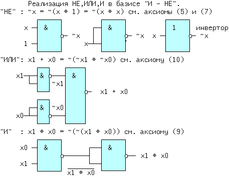 Следовательно базис "И - НЕ" является минимальным. Реализацию НЕ,И,ИЛИ в базисе "ИЛИ - НЕ" произвести самостоятельно, используя перечисленные аксиомы.