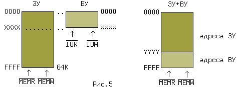 Пояснения : Если ~DEN=0 (разрешение данных) возможно 4 случая (для приведенных диаграмм): 1) M/~IO = 0, ~RD = 0 активны сигналы ввод/вывод (~IO) и чтение-ввод (~RD). 2) M/~IO = 0, ~WR = 0 активны сигналы ввод/вывод (~IO) и запись-вывод(~WR). 3) M/~IO = 1, ~RD = 0 активны сигналы обращения к памяти(M) и чтение-ввод(~RD). 4) M/~IO = 1, ~WR = 0 активны сигналы обращения к памяти(M) и запись-вывод(~WR).