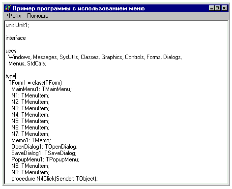 Данная программа демонстрирует использование меню. Она имеет главное меню и всплывающее, которое появляется при нажатии правой кнопки мышки. Меню снабжены клавишами быстрого доступа, используется разделительная линия.