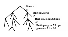 Графическое изображение - дерево поиска. Корень дерева (0 уровень) есть пустой вектор. Его сыновья суть множество кандидатов для выбора а1 и, в общем случае, узлы k-го уровня являются кандидатами на выбор ак при условии, что а1, а2, ..., a(k-1) выбраны так, как указывают предки этих узлов. Вопрос о том, имеет ли задача решение, равносилен вопросу, являются ли какие-нибудь узлы дерева решениями. Разыскивая все решения, мы хотим получить все такие узлы.