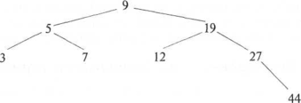 Рис. Пример дерева сравнений, отвечающего бинарному поиску среди сортированных элементов: 3,5,7,9,12,19,27,44