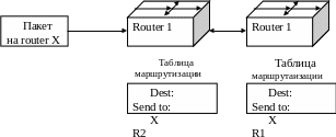 Поэтому маршрутизатор 2 пересылает пакет обратно в маршрутизатор 1. Пакет будет продолжать скакать взад и вперед между двумя маршрутизаторами до тех пор, пока маршрутизатор 2 не получит корректировку маршрутизации, или пока число коммутаций данного пакета не превысит допустимого максимального числа.