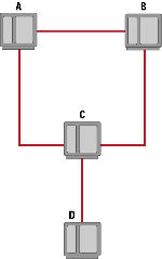 Рассмотрим пример сети с избыточной топологией (см. Рисунок 3). В начальный момент времени А и B знают, что расстояние до узла D равно "2". После выхода D из строя маршрутизатор C, не получив от D сообщения, определяет, что узел D недоступен. А и В продолжают считать D доступным, но правило расщепления горизонта запрещает им сообщать эту ложную информацию маршрутизатору С. При следующем обмене C уведомляет A и B о недоступности D. Но одновременно с этим узел А получает от В сообщение о пути до D стоимостью "2", а узел В получает аналогичное сообщение от А.