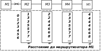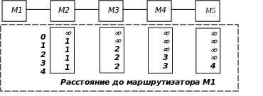 В качестве примера мы рассмотрим сеть (см. Рисунок 4.2) из нескольких последовательно соединенных маршрутизаторов, где метрикой является число транзитных узлов на пути к точке назначения (как в протоколе RIP).