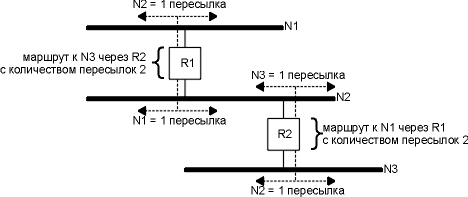Маршрутизатор R1 объявляет маршрут к N2 со счетчиком пересылок равным 1, послав широковещательное сообщение на N1. (Бессмысленно объявлять маршрут к N1 в широковещательном сообщении, посланном на N1.) Он также объявляет маршрут к N1 со счетчиком пересылок равным 1, послав широковещательное сообщение на N2. Точно так же, R2 объявляет маршрут к N2 с показателем 1 и маршрут к N3 с показателем 1. Если смежный с нами маршрутизатор объявил маршрут к удаленной сети со счетчиком пересылок равным 1, то для нас показатель к этой сети будет равен 2, так пакет необходимо послать сначала на наш маршрутизатор, чтобы получить доступ к сети. В примере, приведенном выше, показатель к N1 для R2 равен 2, так же как и показатель к N3 для R1.