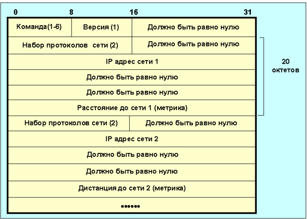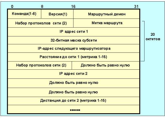 Этот протокол маршрутизации предназначен для сравнительно небольших и относительно однородных сетей (алгоритм Белмана-Форда). Протокол разработан в университете Калифорнии (Беркли), базируется на разработках фирмы Ксерокс и реализует те же принципы, что и программа маршрутизации routed, используемая в ОC UNIX (4BSD). Маршрут здесь характеризуется вектором расстояния до места назначения. Предполагается, что каждый маршрутизатор является отправной точкой нескольких маршрутов до сетей, с которыми он связан. Описания этих маршрутов хранится в специальной таблице, называемой маршрутной. Таблица маршрутизации RIP содержит по записи на каждую обслуживаемую машину (на каждый маршрут). Запись должна включать в себя:
