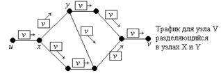 Ветвящаяся маршрутизация с минимальной задержкой. При маршрутизации через пути с минимальной задержкой требуется, и задержка канала зависит от использования (таким образом, предположение (1) в начале этого раздела не имеет силу), стоимость использования пути не может просто быть оценена как функция этого единственного пути. Кроме того, трафик на канал должен быть принят во внимание. Избегать скопления пакетов (и возникающую в результате этого задержку) на пути, обычно необходимо посылать пакеты, имеющие ту же самую пару исходный-адресат через различные пути; трафик для этой пары "распределяется" в один или большее количество узлов промежуточного звена как изображено в Рисунке 4.3. Методы маршрутизации, которые используют различные пути к одному адресату, называются много-путевыми или ветвящимися методами маршрутизации. Потому что ветвящиеся методы маршрутизация являются, обычно, очень запутанными, они не будет рассматриваться в этой главе