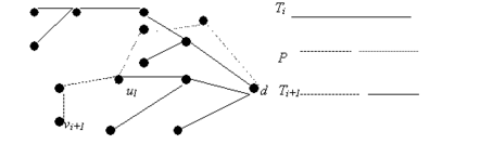 Конструируя последовательность деревьев, положим Vd = {d} и Eo =  . Дерево Ti+1 построим следующим образом. Выберем оптимальный простой путь P=<uo, . . ., uk> от vi+1 к d, и пусть l будет наименьшим индексом таким, что ul Ti (такое l существует, потому что ul = dTi ; возможно l = 0). Теперь: