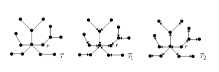 Доказательство. Из Теоремы 5.13, достаточно дать ациклическую ориентацию для дерева, которая покрывает все простые пути. Выберем произвольную вершину r, и получим T1 ориентацией всех ребер по направлению к r и T2 ориентацией всех ребер от r; см. Рисунок 5.5.