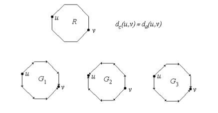 Во-первых рассмотрим простой случай, когда Существуют вершины u и v с d(u, v) = C/2. G1 и G3 получаются ориентацией всех ребер по направлению к v, и G2 получается ориентацией всех ребер по направлению к u: см. Рисунок 5.4.