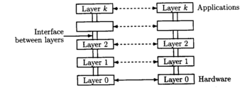 Сложность задач, выполняемых подсистемой связи распределенной системы требует, чтобы эта подсистема была разработана высоко структурированным способом. К этому моменту, сети всегда организовываются как совокупность модулей, каждое выполнение очень специфическая функция и основывающаяся на услугах, предлагаемых другими модулями. В сетевых организациях имеется всегда строгая иерархия между этими модулями, потому что каждый модуль исключительно использует услуги, предлагаемые предыдущим модулем. Модули названы уровнями или уровнями в контексте сетевой реализации; см. 1.4 Рисунок. Каждый уровень осуществляет часть функциональных возможностей, требуемых для реализации сети и полагается на уровень только ниже этого. Услуги, предлагаемые i уровнем i + 1 уровню точно описаны в интерфейсе i уровня и i + 1 уровня (кратко, i / (i + 1) интерфейс). При проектировании сети, в первую очередь, нужно определить число уровней и интерфейсов между последующими уровнями.