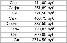 =914,00+351,89+721,58+468,75+337,50+120,87+800,00=3714,58 (руб)