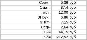 SO =6,86+7,15+2,64+12,00*5,36+87,4+44,15=212,52 (руб)