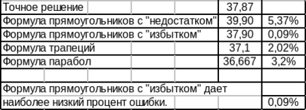 11. Итого, в нашем случае, минимальный процент ошибки дает вычисление интеграла по формуле прямоугольников с избытком. Ошибка составляет 0,09%.