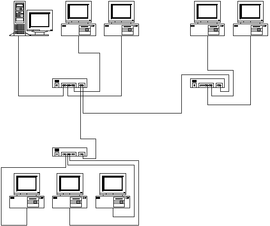 Оптический шинный звездообразный ответвитель посылает оптические сигналы всем станциям сети. Он представляет собой эквивалент концентратора стандарта 10BaseT. Использование повторителей позволяет, во-первых, увеличить расстояние, на которое передается информация, и, во-вторых, реализовать "каскадные звезды" путем соединения оптических звездообразных ответвителей. На рынке предлагаются различные модели этих ответвителей (в этом легко убедиться на примере ассортимента изделий фирмы Codenoll): коаксиальный - волоконнооптический, волоконнооптический - волоконнооптический, коаксиальный - коаксиальный. Реальные волоконнооптические кабели поставляются с уже смонтированными соединителями и заменяют собой коаксиальные кабельные системы и витые пары. Схема сети Ethernet на волоконной оптике представлена на Рис. 2.
