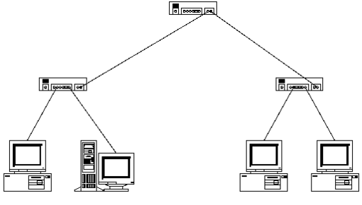 Таким образом, схема арбитража запросов по приоритетам позволяет работать множеству концентраторов по принципу равного доступа и без снижения эффективности сети. Как и 10BaseT, сеть 100-VG AnyLAN можно сегментировать с помощью мостов и коммутаторов, обеспечивая таким образом одновременную передачу пакетов в отдельных подсетях, что еще более увеличивает полосу пропускания для отдельных узлов и серверов. Вариант топологии сети 100-VG AnyLAN представлен на Рис. 3.
