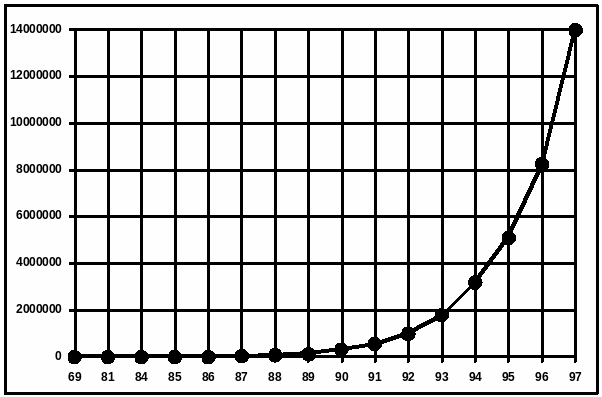 Спустя некоторое время TCP/IP был адаптирован в обычный, то есть в общедоступный стандарт, и термин Internet вошел во всеобщее употребление. В 1983 году из ARPANET выделилась MILNET, которая стала относиться к Defence Data Network (DDN) министерства обороны США. Термин Internet стал использоваться для обозначения единой сети: MILNET плюс ARPANET. И хотя в 1991 году ARPANET прекратила свое существование, сеть Internet существует, ее размеры намного превышают первоначальные, так как она объединила множество сетей во всем мире. Рисунок 2.2 иллюстрирует рост числа хостов, подключенных к сети Internet с 4 компьютеров в 1969 году до 14 миллионов в 1997 году.