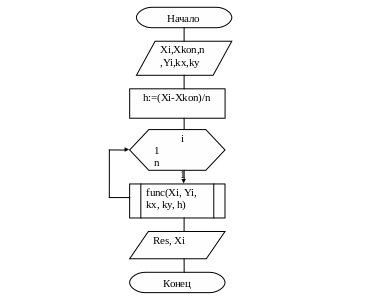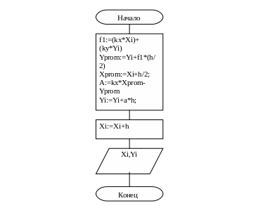 | 1 | Вычисление: функции f1 с подстановкой начальных значений; промежуточных значений Yprom и Xprom, значения a для вычисления f(Xprom,Yprom) и расчёт результатов функции и переход на следующий шаг. |