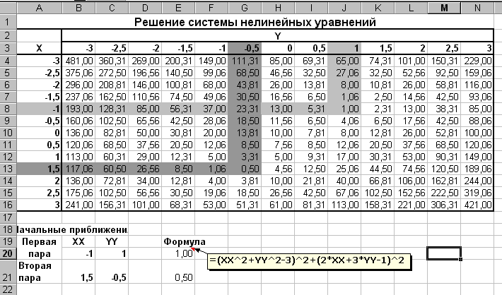 ешением системы являются пары (-1,269; 1,1791) и (1,5764; -0,718).