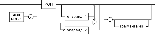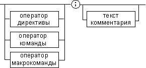 Предложения, составляющие программу, могут представлять собой синтаксическую конструкцию, соответствующую команде, макрокоманде, директиве или комментарию. Для того чтобы транслятор ассемблера мог распознать их, они должны формироваться по определенным синтаксическим правилам. Для этого лучше всего использовать формальное описание синтаксиса языка наподобие правил грамматики. Наиболее распространенные способы подобного описания языка программирования — синтаксические диаграммы и расширенные формы Бэкуса—Наура. Для практического использования более удобны синтаксические диаграммы. К примеру, синтаксис предложений ассемблера можно описать с помощью синтаксических диаграмм, показанных на следующих рисунках.