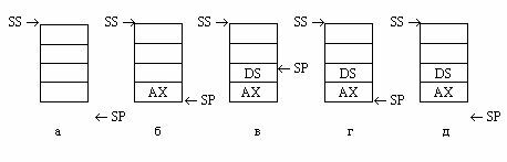 Рис 4. Организация стека: а - исходное состояние, б - после загрузки одного элемента (в данном примере - содержимого регистра АХ), в - после загрузки второго элемента (содержимого регистра DS), г - после выгрузки одного элемента, д - после выгрузки двух элементов и возврата в исходное состояние.