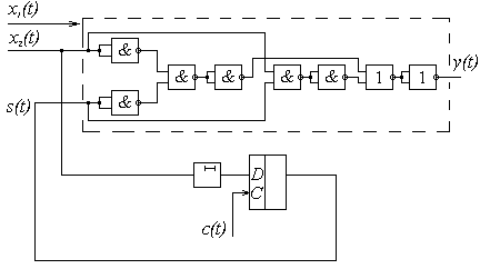 В этом разделе был показан пример минимизации (упрощения) конечного автомата с сокращением числа состояний, а также пример реализации автомата на логических элементах и элементах памяти. Мы убедились в том, что конечный автомат является расширением понятия комбинационной схемы на случай, когда для получения выходного сигнала в данный момент времени требуется “помнить” некоторое количество предыдущих значений входного сигнала, а не только его текущее значение. При практической реализации автомата стала очевидной польза проведённых операций по упрощению исходного автомата и приведению его комбинационной части к конкретному базису.