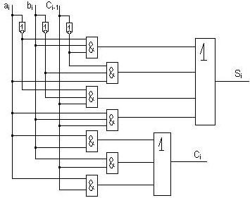 При сложении двоичных чисел на уровне I-го разряда необходимо учитывать двоичные цифры ai и bi, а также возможный перенос из соседнего младшего разряда. Элементарное устройство, выполняющее суммирование указанных двоичных цифр называется полным одноразрядным двоичным сумматором (ПОДС).