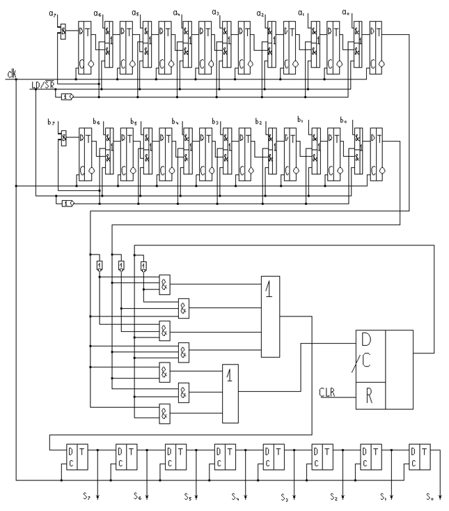 На базе полученной схемы одноразрядного двоичного сумматора можно построить заданный сумматор. При этом нужно осуществлять загрузку двух восьмиразрядных чисел, а также сдвиг результата вправо.