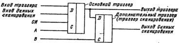 Второй триггер пары, или триггер сканирования, используется главным образом для тестирования. Его вход постоянно соединен с выходом первого триггера, а синхросигнал поступает только от средств тестового диагностирования.