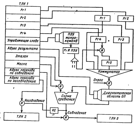 С помощью операции «Сравнение я ветвление» обеспечивается сравнение ответа ДУ на тестовое воздействие с эталонной информацией. ТЛН задается адрес состояния проверяемого регистра или триггера в оперативной и служебной памяти, записываемого с помощью операции «Опрос», а также его эталонное состояние. Возможны два исхода операции «Сравнение и ветвление»— совпадение и несовпадение ответа с эталоном. Метод двухэтапного диагностирования использует, как правило, условный алгоритм диагностирования. Поэтому ТЛН содержит два адреса ветвления, задающих начальный адрес следующих ТЛН в оперативной памяти.