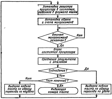 Стандартный формат ТЛН показан на рис. 8. Тест локализации неисправностей содержит установочную и управляющую информацию, адрес ячейки памяти, в которую записывается результат элементарной проверки, эталонный результат, адреса ТЛН, которым передается управление при совпадении и несовпадении результата с эталонным, и номер теста. Стандартные диагностические операции, последовательность которых приведена на рис. 9, могут быть реализованы аппаратурно или микропрограммно.