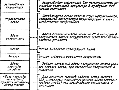 Диагностическая информация, включающая в себя данные тестового воздействия, результат и состав контрольных точек элементарной проверки, адреса следующих элементарных проверок в алгоритме диагностирования, имеет стандартный формат, называемый тестом локализации неисправностей (ТЛН).
