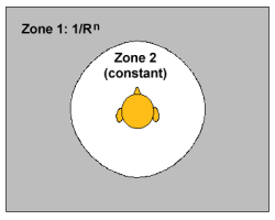 DS3D предусмотрено три зоны (две из них показаны на рисунке слева). Зона 0 в ней располагаются сильно удаленные источники звука, которые имеют постоянную интенсивность, не зависящую от расстояния. Источники в этой зоне могут не приниматься во внимание, т.е. слушатель их не слышит, либо они используются для формирования реверберации. Зона 1 это т.н. дальнее поле, в ней располагаются источники на расстоянии более 1 метра от слушателя и до определяемой разработчиком границы. В этой зоне интенсивность источников звука обратно пропорциональна расстоянию до слушателя. В зоне 2 (ближнее поле, расстояние до 1 м от слушателя) все источники звука имеют постоянную интенсивность. Это сделано для того, чтобы уровень громкости не превысил допустимого барьера и с целью ограничения нагрузки на шину данных.