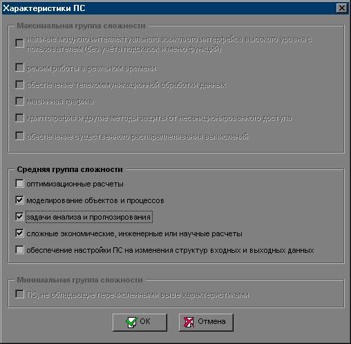 Группа сложности – группа сложности разрабатываемого ПС. Группа сложности выбирается автоматически в зависимости от того, к какой группе относятся выбранные пользователем характеристики ПС;