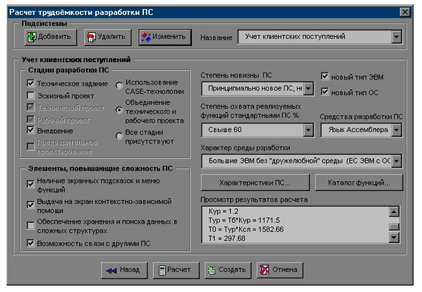 С помощью списка “Название” пользователь выбирает название подсистемы, при этом в остальной части окна “Расчет трудоемкости разработки ПС” устанавливаются параметры этой подсистемы.