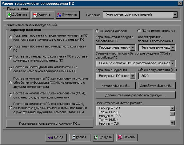 В поле “Просмотр результатов расчета” отображаются результаты расчетов трудоемкости сопровождения данной подсистемы, а именно: