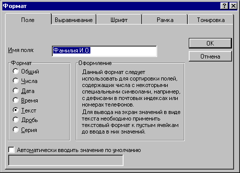 Имя поля Выделенная область значения поля
