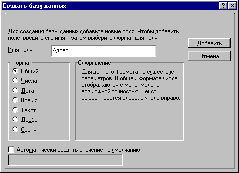 Для создания поля следует присвоить имя пустому полю. Каждому полю должно быть присвоено уникальное имя. Например, одному полю можно присвоить имя "Фамилия", а другому - "Адрес".