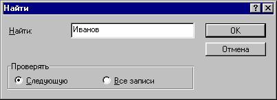 В строке Образец записывается текст или часть текста. по которой требуется вести поиск. В нашем примере -это фамилия «Иванов». В отделе Проверять устанавливается условие, проверять ли все записи или только найти черную попавшуюся запись в требуемом контексте. При выборе условия Следующую будет найдена и выведена на экран только одна запись, та, которая была найдена первой. При выборе условия Все записи будут найдены и выведены на экран все записи, содержащие данный контекст.