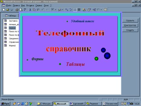 Чтобы пользователи могли рассмотреть заставку, в приложении «Первая» свойство Интервал таймера (TimerInterval) получает значение 5000 миллисекунд (т.е. 5 секунд) в процедуре обработки события Открытие и сбрасывается до 0 в процедуре обработки события Таймер.