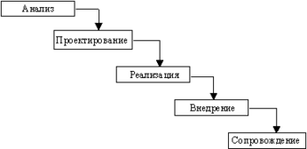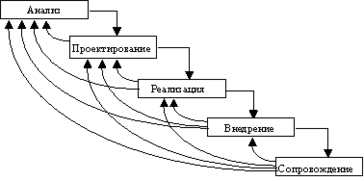 середине 80-х годов наибольшее распространение получил "водопадный" (waterflow) или "каскадный" процесс создания программного обеспечения. Схема "водопадного" процесса приведена на рис. 1.1. Его основной характеристикой является разбиение всей разработки на этапы, причем переход с одного этапа на следующий происходит только после того, как будет полностью завершена работа на текущем. Каждый этап завершается выпуском полного комплекта документации, достаточной для того, чтобы разработка могла быть продолжена другой командой разработчиков.