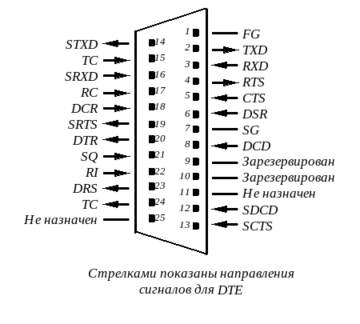 Рис. 1. Назначение линий 25-контактного разъема типа D для интерфейса RS-232C
